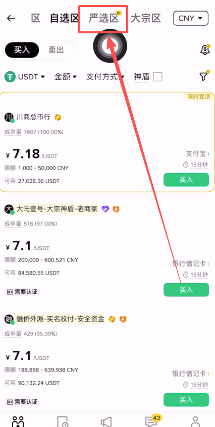 我们在上方可以看到有快捷区、自选区、还有严选区、后面还有大宗区,我们选择【严选区】。