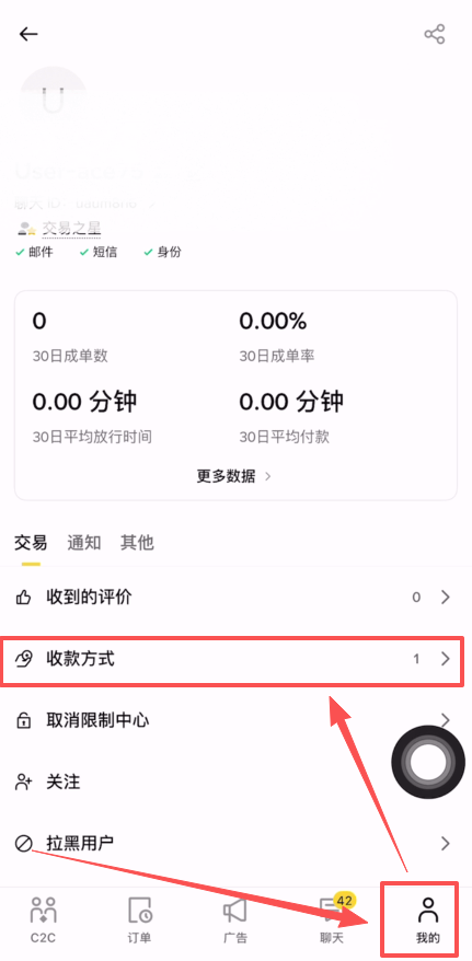 还没有添加收款方式的朋友,可以点击右下角的【我的】,然后选择【收款方式】。