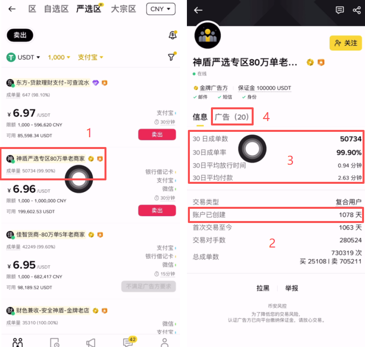我们再来看一下这家的注册时间,可以看到这个账户已经创建有1078天了,代表这个账户已经创建大概至少有三年了。而且他近30天的成单数和成交率都比较高,平均放行时间在0.94分钟,平均付款时间在2.63分钟,这一家就是可以的,我们就可以跟这家来进行出售。在旁边点击【广告】。