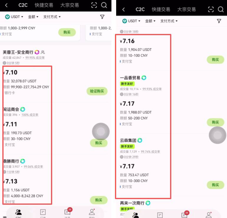 首先,我们来看一下在欧易交易所和币安交易所,一颗USDT的价格分别是多少。打开币安交易所可以看到,一颗USDT的价格是7.11U到7.12,7.13,一直往下,以此类推。