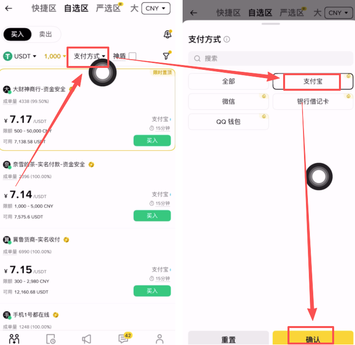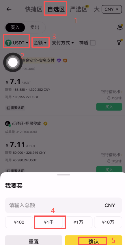 我们在币安交易所上方选择“自选区”,自选区就是个人对个人交易。要买的币种选择USDT,在金额这里我们筛选出1000。