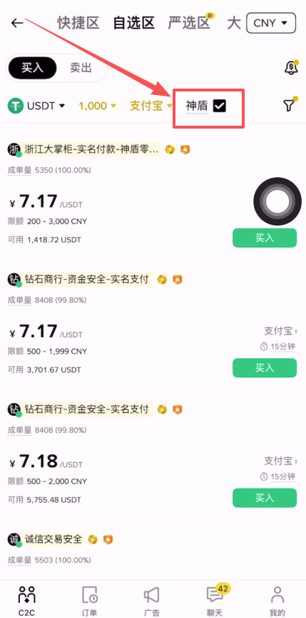 然后勾选一下神盾商家,然后币安平台就会为我们筛选出来了。