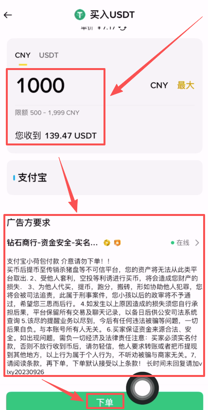 再次输入一下要购买的金额,他也会自动为我们算出来,我们支付1000人民币将收到139.47颗USDT。然后在下方阅读一下广告方的要求,再点击下方的【下单】。