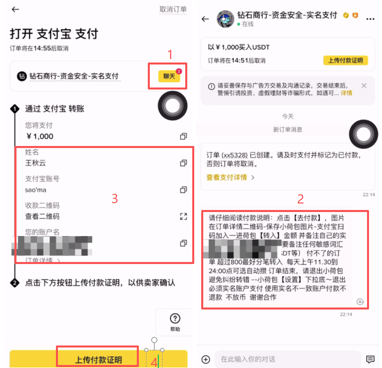 之后点击右上角的【聊天】,我们根据商家提供的支付方式给对方转钱。转完钱之后在你的付款记录进行截图,截图好之后点击【上传付款证明】。然后我们就等待商家收到钱之后,就会把币打给我们了。