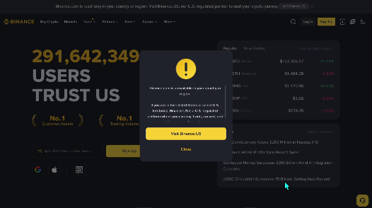 如果你用了美国的IP会显示什么样子,如果你用了美国的IP它会引导你去访问币安的美国站。