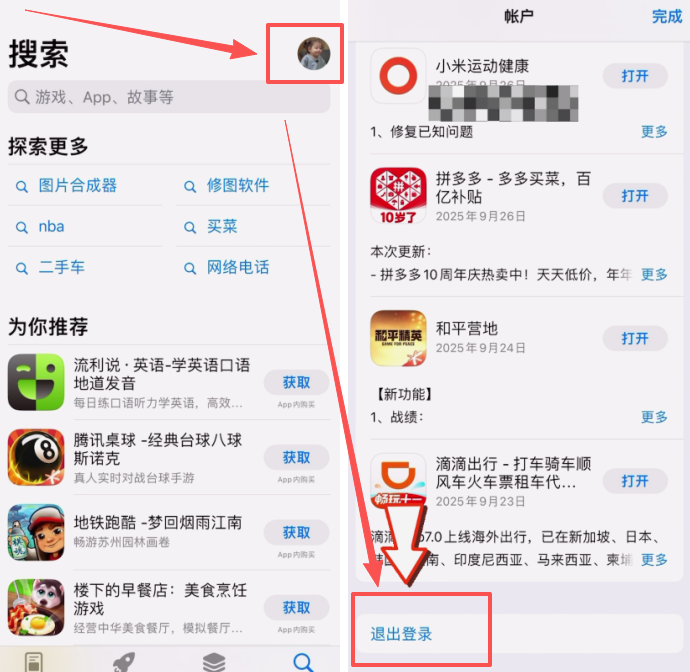 购买完台区的apple ID之后,我们就可以打开我们的apple store。接下来我就开始用手机来给大家演示。点击右上角的小人头,往下捯,点击【退出登录】。