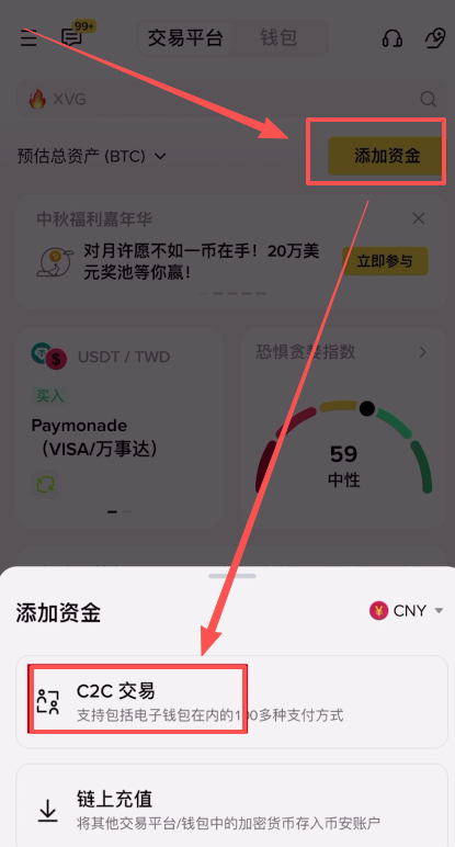 接下来我再来简单的给大家演示一下,我们如何去买币。在币安的首页这里点击【添加资金】,选择【C2C交易】。