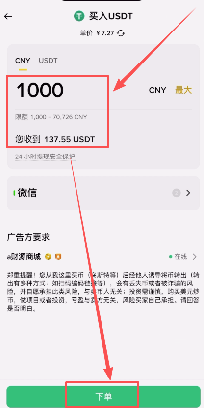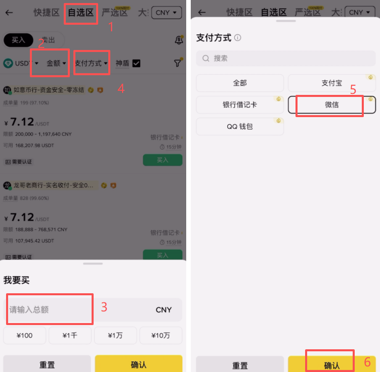 入金的话我们就可以直接使用这个自选区的买入功能,然后自行去筛选一些比较靠谱的商家。如何筛选呢?首先我们可以筛选一下想要购买的金额,比如说我要购买1000人民币的USDT,然后筛选一下我们的支付方式,比如说我想用微信进行付款,点击【确认】。