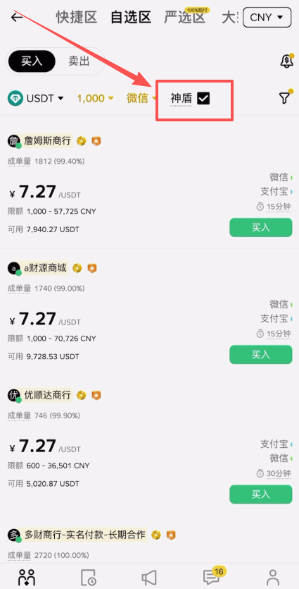 “严选区”就相当于是自选区的卖出区域,严选区它是只有卖出这一个功能的,也就是说它是专门针对于出金的,我们可以看到它这里给我们写了一个百分百赔付。因为严选区的商家都是神盾的商家,他们在平台押了大量的保证金,如果在我们跟他交易的过程中出现了什么问题,这导致我们的资金被冻结、被封号等等。它是会百分百对我们进行赔付的,所以我们在出金的时候,使用这个严选区是最安全的。