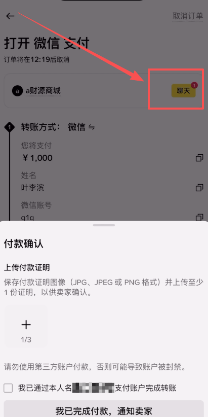 这个时候我们的订单就生成了,这个商家的姓名以及微信账号,还有收款二维码都会给我们显示出来了。这个时候就需要我们离开平台去到微信里面添加他的好友,或者使用扫一扫的功能去给他转账。转账完成之后记得截一下图保留凭证,再回到平台点击【上传付款证明】。