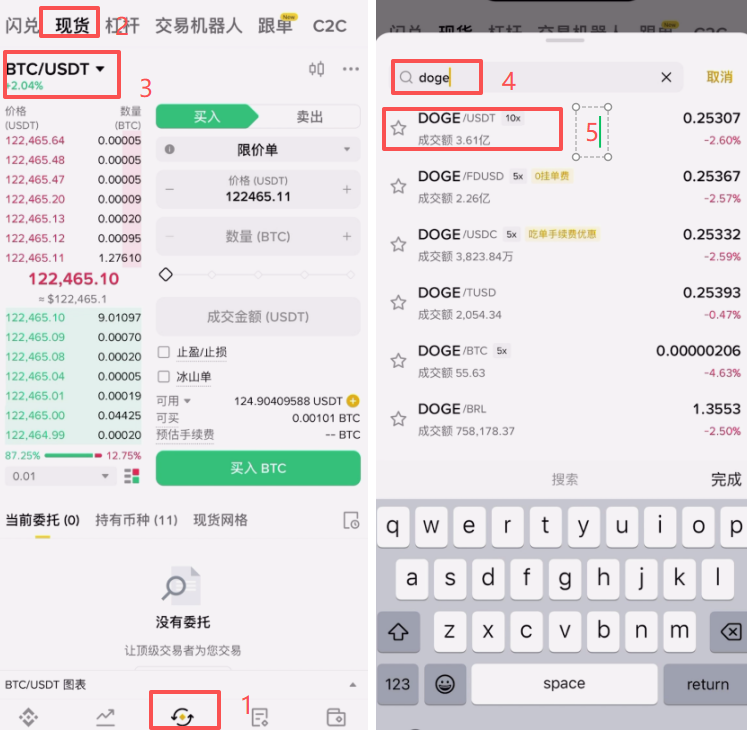 这样我们就可以用这笔USDT去进行现货交易了。点击下方中间的【交易】,选择【现货】。左上角这里可以选择我们要进行交易的交易对,比如说我想购买DOGE狗狗币,我就搜索“DOGE”,然后选择“DOGE/USDT”这个交易对。