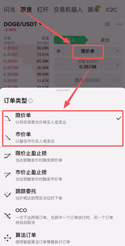 在买入的这个页面,下方这里有一个限价单,限价单和市价单是两种我们比较常用的订单类型了。