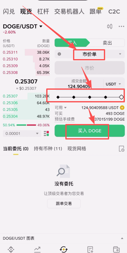 我们再换成市价单看一下。市价单这里价格就不需要我们自己去填了,平台会以当前市场最优惠的价格直接给我们进行下单。我们可以直接输入想要购买的数量,点击【买入DOGE】。这样我的狗狗币就直接购买成功了。