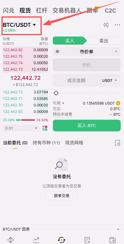 当然买比特币也是一样的,我们还可以在这里直接去搜索BTC,选择“BTC/USDT”这个交易对。