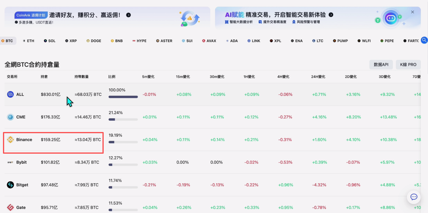 我们再来看看合约持仓量,所谓的合约持仓量可以简单理解为这个交易所的当日营业额。现有的这些交易所里面,币安还是排在第一的。上面的CME还有ALL,因为是美国的期货交易所,我们用不了,所以就不在我们的对比之列。