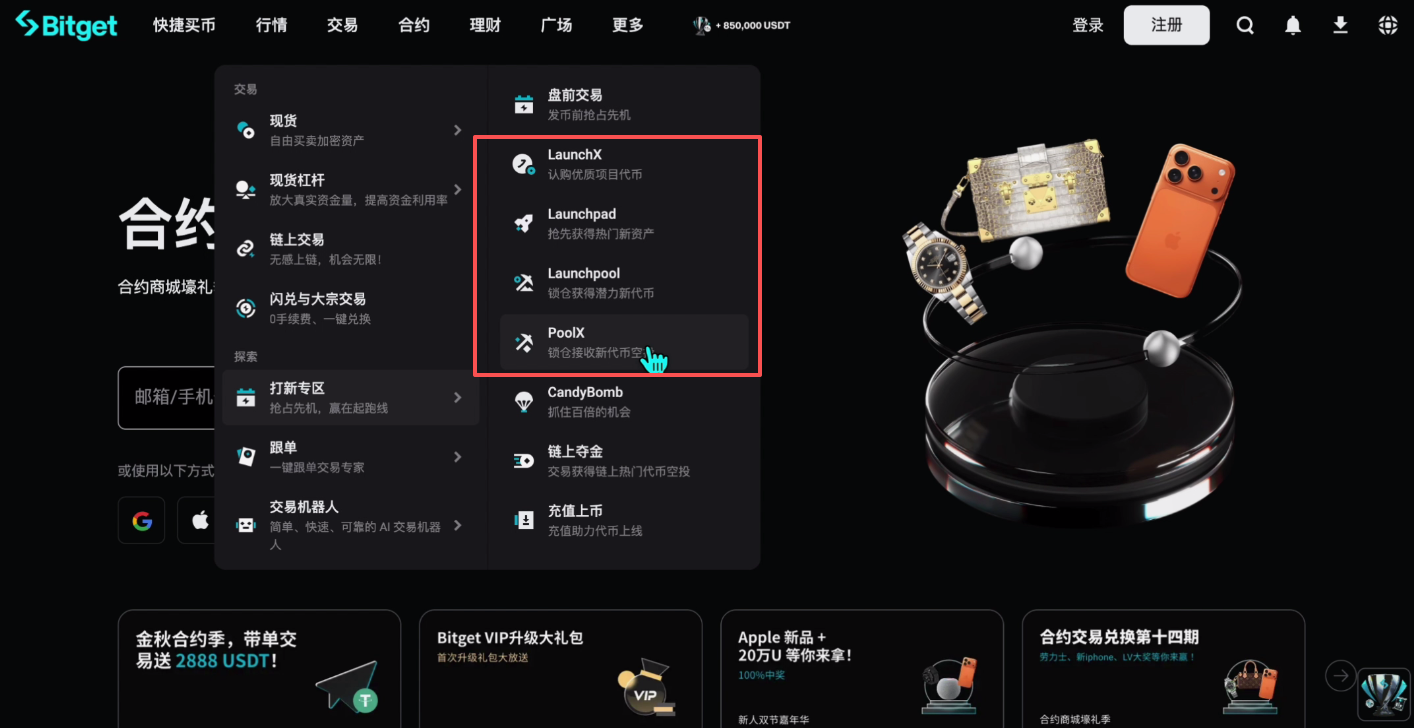 而且擅长去做打新,它甚至做了一个打新的专区。你能够在里面通过launchx、launchpad、launchpool、poolx,各种花样应有尽有,来获得一些新币的空投。