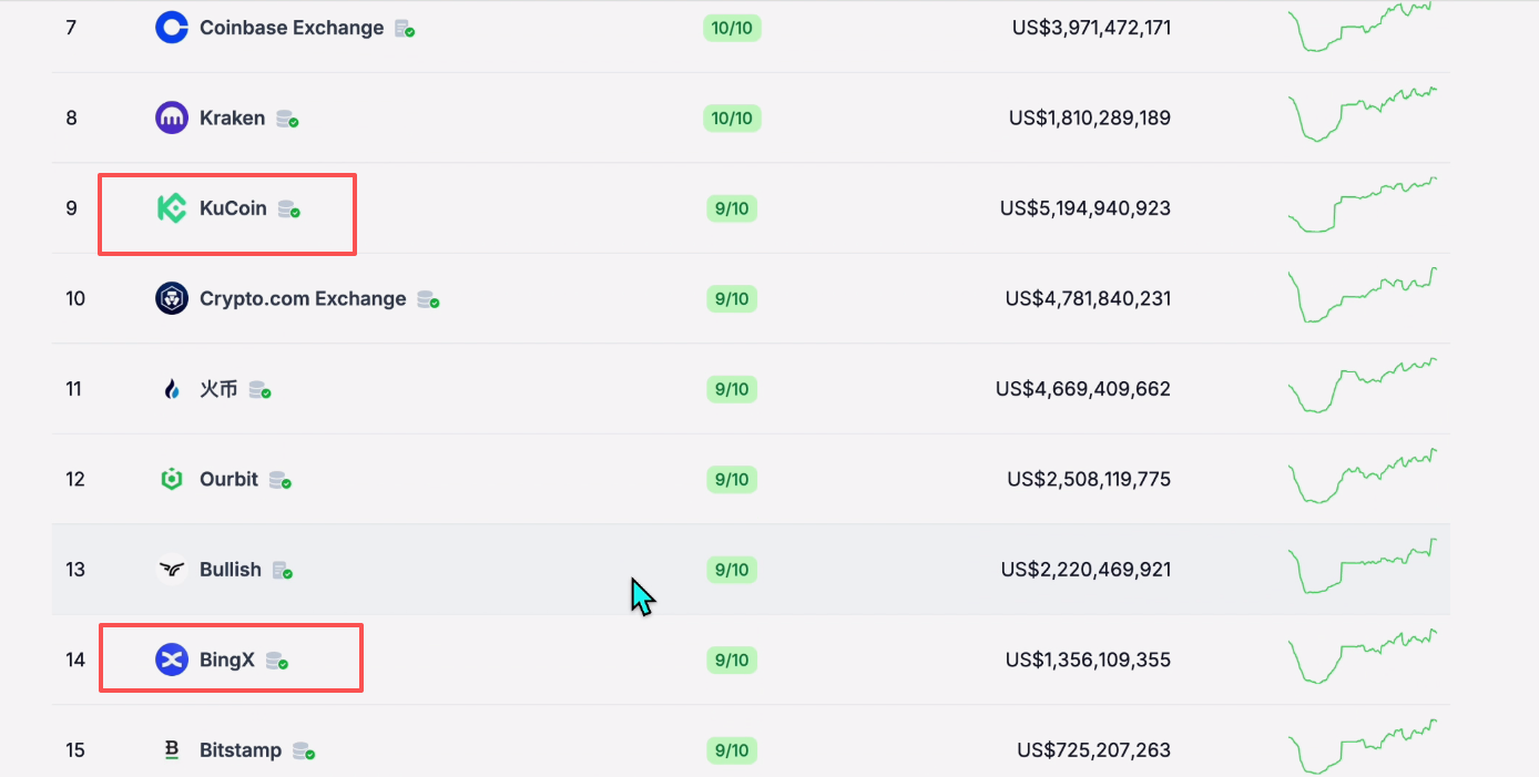 其次是Bitget交易所,Bitget交易所作为一个新兴的交易所,你可以把它理解为是OKX和币安的一个补充。Coingecko里面Bitget是排到了第四位的。