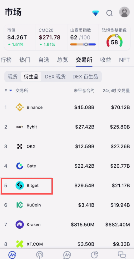 目前Bitget交易所在Coinmarketcap里面,现货交易量排名在第6位,衍生品排名在第5位。