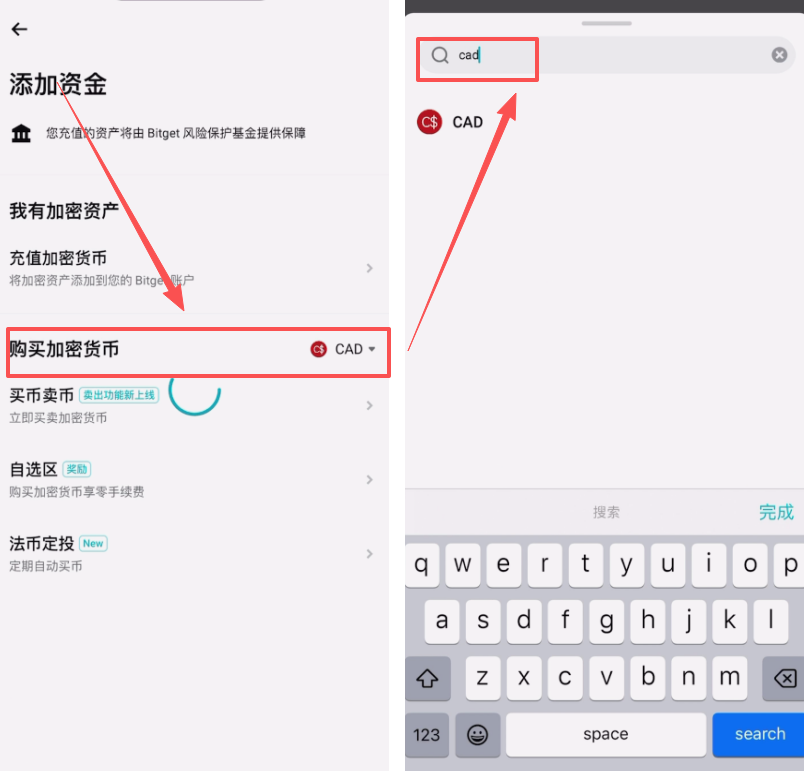 在购买加密货币这一栏,我们可以选择一下我们要使用的法币,这里可以直接搜索到CAD。
