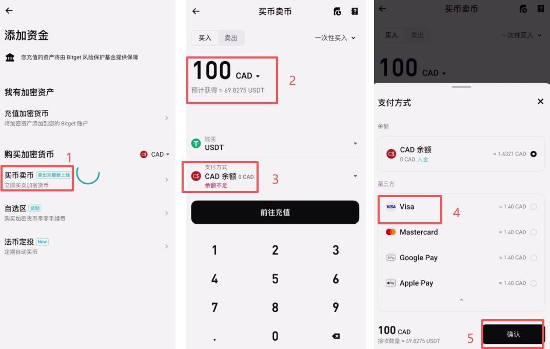 然后我们选择【买币卖币】的功能,这个功能可以让我们在入金的时候更加的方便快捷。我们可以直接输入想要购买的金额,比如说我想购买100加元的USDT,他给我们估算出来,我大概可以收到69.8个U。下方的支付方式这里你可以使用你的CAD余额,你可以进行充值,我们还可以用第三方的支付方式去进行购买,比如说Visa、Mastercard、Googlepay和apple pay。比如说这里我就选择Visa,点击【确认】。点击购买USDT之后,就会为我们生成一个订单,我们只需要根据卖家的要求离开平台去给他转账就可以了。