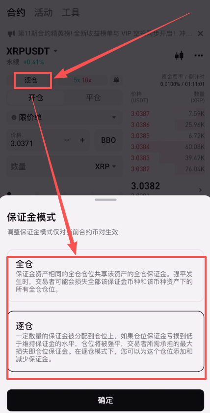 这里有一个全仓和逐仓。“全仓”指的就是一旦爆仓,你会失去你拥有的所有的保证金。“逐仓”就是你的某一笔交易一旦爆仓了,只会损失你那笔交易下的保证金,所以一般我们都是选择逐仓。