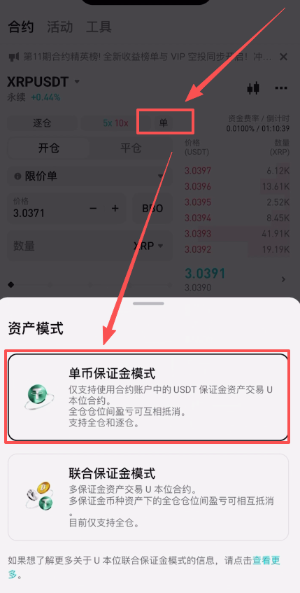 介绍完出入金之后,我们再来说一下如何在加拿大做合约交易。我们点击下方的【合约】来到合约交易的页面。左上角这里可以选择我们想要进行的交易对,比如说我现在想做XRP的合约,那我就选择XRPUSDT永续。