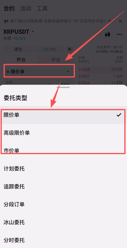 下面还有一个限价单根市价单,限价跟市价其实跟现货交易时候的限价和市价是一样的。限价单就是需要我们自己去设定一个理想的价格,等市价达到了我们想要的那个价格之后,这个单子才会成交。而市价单就是以当前市场最优的价格立即生效。
