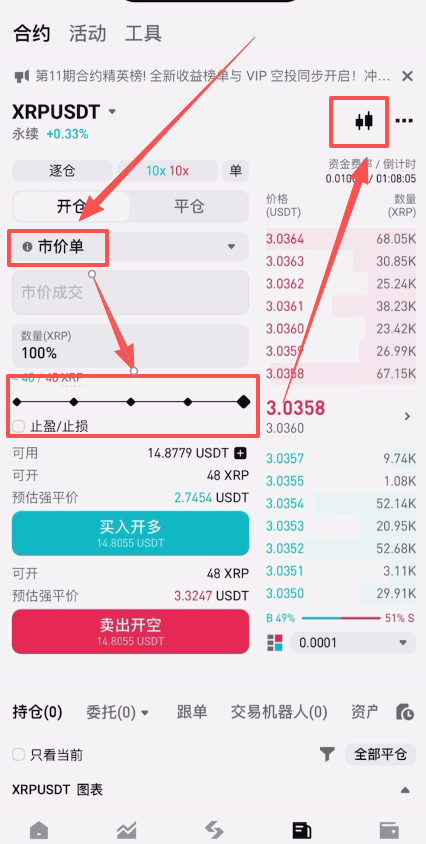 这里我就以市价单来演示,数量这里我把他拉满,用我全部的USDT。然后我们可以点击右上角的小烛台图标。