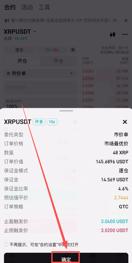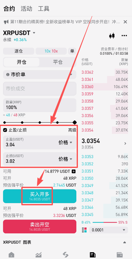 这里我想选择买入开多。上方还有一个止盈止损,“止盈”就是这笔交易处于一个对我有利的方向发展,正在让我赚越来越多的钱,而我认准一个价格想建好就收,我就可以把这个价格填进去。我希望等这个价格涨到3.04的时候就停止这笔开多,我们就把他输入进来。“止损”就是这笔交易正在让我亏钱,而到了一个什么样的价格,平台会自动帮我平仓,以此来减少我们的损失,这个就是止损。因为我是买涨,假设它会跌,我想等它跌到3.02就不玩了,我就退场了,就可以输入进去。然后点击【买入开多】。