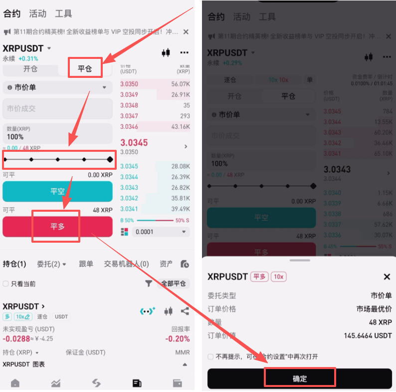 或者说你可以来到下图这里,使用“平仓”的部分。因为我们刚刚是开多,如果我们要平仓就是选择“平多”,这里滑杆把他拉满就证明我要全部的平多,再点击【确定】。现在这笔合约就已经被我平仓了,这就是合约交易的流程。