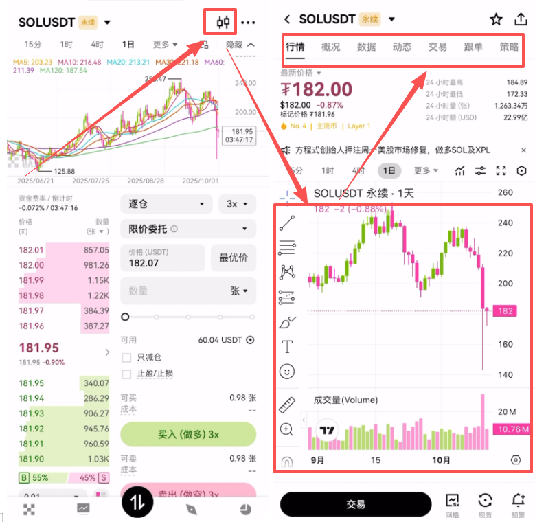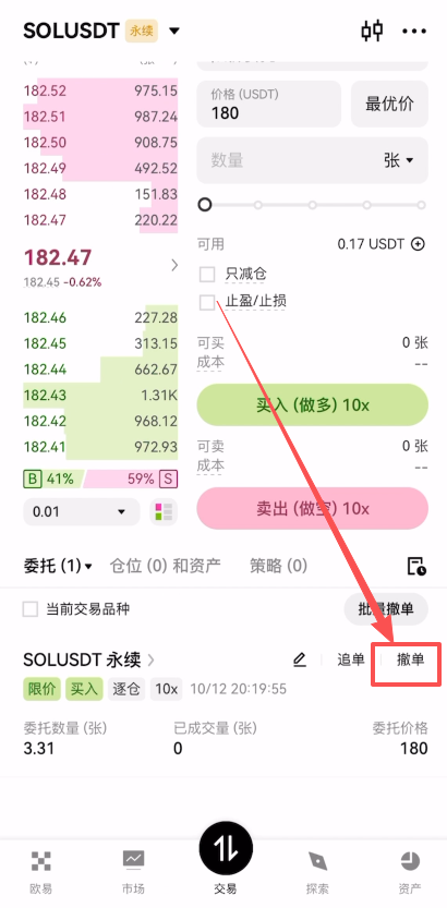 我们挂的这笔单子也会有一些详细的信息,比如说委托的数量、已经成交的数量,还有委托价格都会在这里面显示出来。而在资产页面你的USDT也会成为冻结的状态,因为这部分资产已经被你占用了,他是一个待成交的状态,所以有冻结你也不用担心,这个钱并不是丢了,或者是出现了什么问题。一旦这个市价到了你挂单的价格之后,系统会自动帮你买入限价委托。大概就像你站在市场上大喊,虽然现在这个SOL的市价是181,但是我就是以180想买,有人卖给我吗?没有的话我就一直在这里等着,什么时候这个市价跌到了180了,你们得优先卖给我。