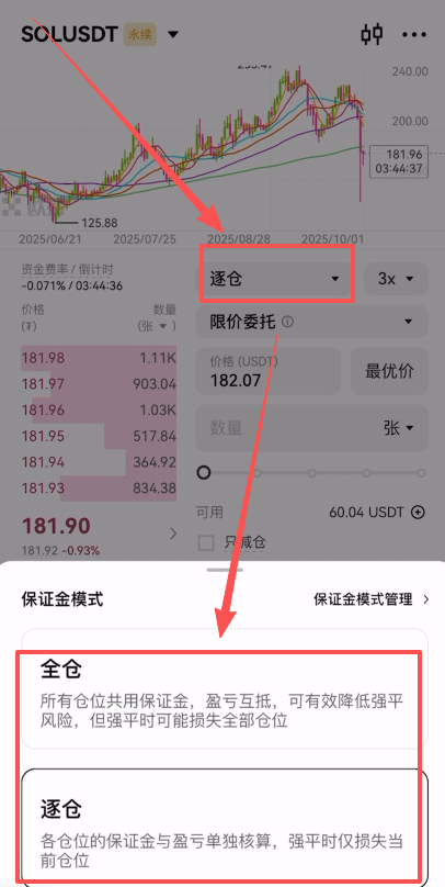 接下来我们来看右边这里有一个逐仓,逐仓这里分为全仓和逐仓,是需要我们去选择的一个保证金模式。“逐仓”就是你的每笔合约交易他的保证金和盈亏都是单独核算的,如果你的某笔交易被强行平仓了,那么只损失你那笔交易下的保证金,不会波及你账户里面其他的资产。“全仓”是指你所有的仓位都是公用保证金的,他们的盈亏是互抵的,虽然可以有效降低强平风险 ,但是你的其中一笔交易一旦被强平,你可能就会损失你账户里面全部的保证金,所以我们一般都选择“逐仓”。