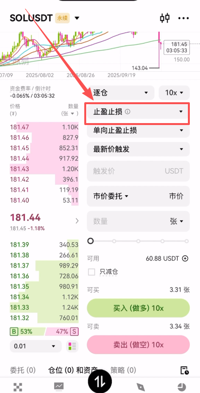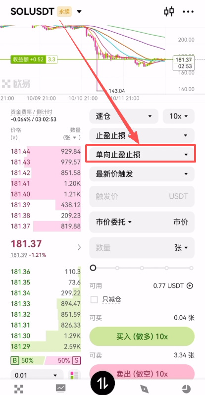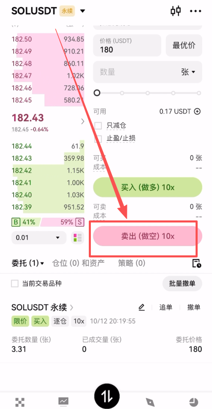 我们先来说一下限价委托,限价委托是指用户设置的委托数量,以及可接受的最高买价或者最低卖价。当市场价格符合用户预期的时候,系统会以限价范围内最优的价格进行成交。这个限价委托基本上就是我们常说的挂单,比如说这个时候SOL的价格是181.72,你觉得太贵了,或者觉得还有一定的回调空间,你就可以挂一个单。比如说当它跌到180的时候你就可以接受这笔交易了,然后输入输入数量,输入数量之后系统会自动计算数量,你可以买入做多多少张,或者是卖出做空多少张,当然是乘以这个杠杆之后的。比如说经过我的考虑之后,我决定买入做多这个单子,我就选择【买入做多】。