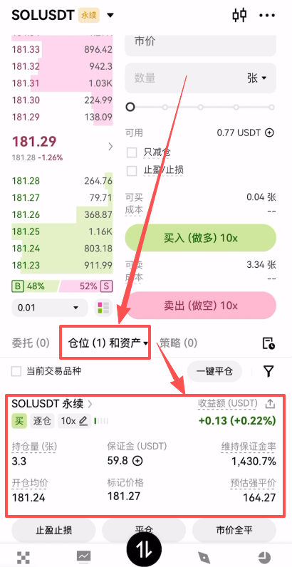 可以看到它现在已经生效了,在“仓位和资产”这里。如果你不想完了,也是直接点击这里的【市价全平】。或者在这里也可以去添加上止盈止损。