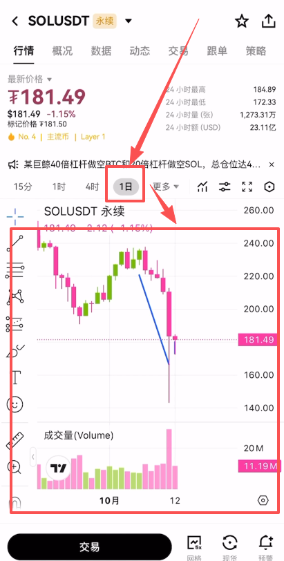 接下来我们来看,下方这里有一个它的K线图,根据不同的时间维度,我们可以对它的价格趋势去做一个判断。