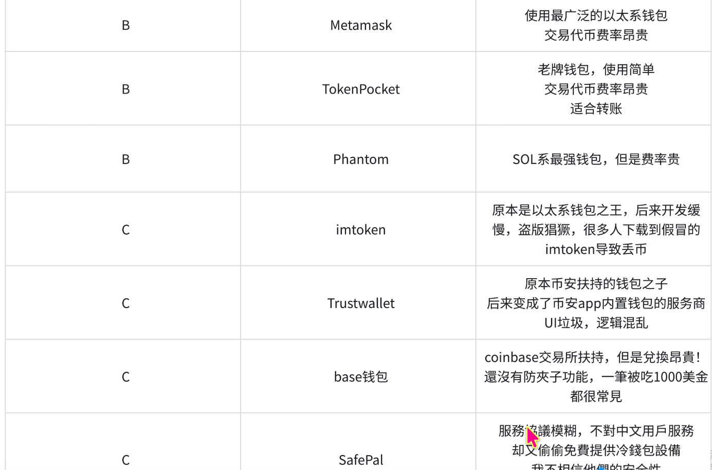我们来看一下下图这张表,B级的这几个像Maetamask,也就是我们常说的小狐狸。还有tokenpocket 、Phantom都是久经沙场的老将了,可以说是行业的标准配置。尤其是小狐狸钱包简直就是进入Web3世界的通行证,谁都绕不开它。像“Metamask”它是使用最广泛的以太系钱包,交易代币费率是很昂贵的。