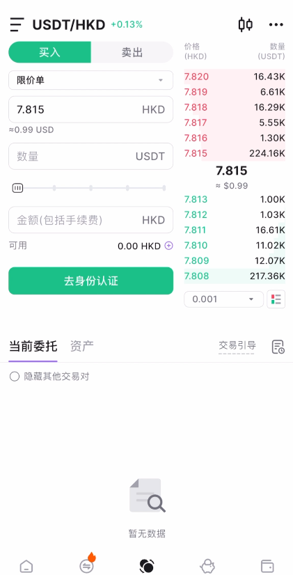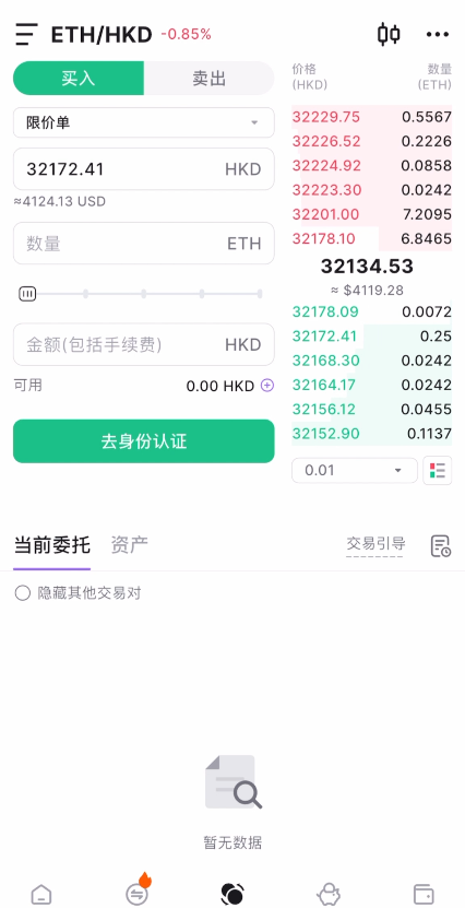 为了将我们的港币换成数字货币之后,能够很便捷的提走,你最好是选择以太坊这个币种,不要去购买比特币。在这我们就正常的去做身份认证,然后充值港币。充完港币之后在他的现货交易这里,选择“ETH/HKD”这个交易对。买完以太坊之后,我们就能够把这个以太坊提走了。
