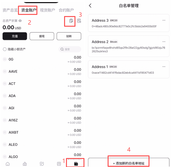 接下来我们就要添加一个以太坊的提币白名单,有了这个白名单之后,他才允许你把钱提到白名单地址里面。我们点击下方的【资产】,找到【资金账户】。点击右侧的图标,这里是“白名单管理”,我们选择“添加新的白名单地址”。
