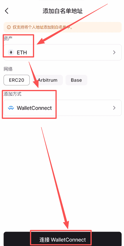 添加的资产是以太坊,如果我们通过其他虚拟货币去添加白名单会超级超级的麻烦,它的这种限制是故意而为的。它故意搞得很麻烦,就是不想让你把钱提走。我们选择连接认证的方式是Wallet connect。选择链接钱包。
