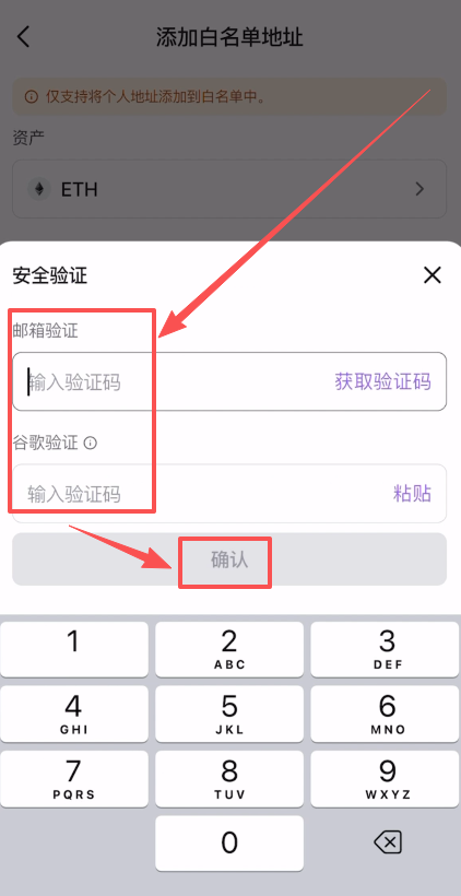 点击【确认】,继续验证一下我们的邮箱和谷歌验证器,点击【确认】。