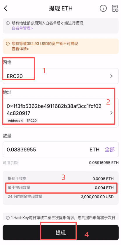 提现的网络就是ERC20,提现的地址就选择我们刚刚已经添加完的白名单的地址。目前它提现的时候是最少要求我们提现0.04个ETH的,所以我们要保证账户里面有充足的ETH可以让我们能够提现。我这里准备好了之后就点击【提现】。