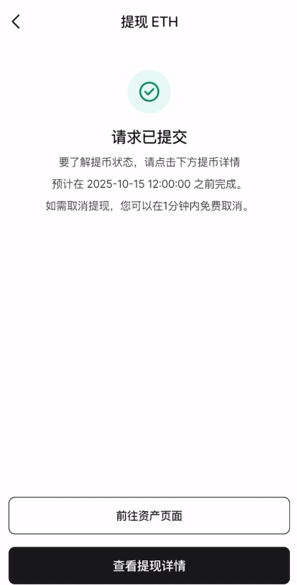 我们添加完白名单之后,就能够把账户里面的钱给它提走了。首先你要点击一下【提现】的按钮,选择提现的资产就是以太坊。地址来源我们就可以选择“个人钱包”。