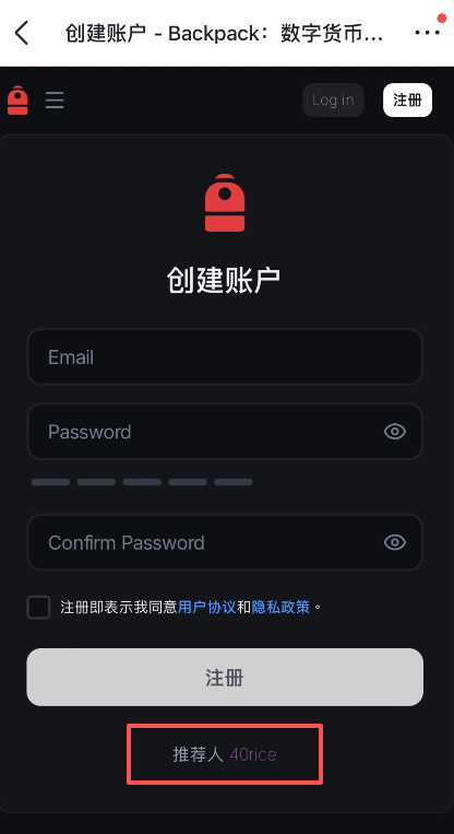接下来我就要把这个币给它提到backpack交易所了,如果你还没有Backpack交易所,可以点击我下方Backpack交易所的注册链接,使用邀请码40rice进行注册,就能够让我们在后续的交易中,永久享受20%的手续费减免。