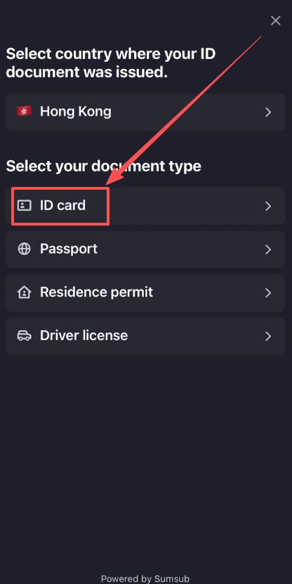 国家这里我们可以搜索到香港,下面可以选择你是用身份证、护照、居住证或者是驾照。我这里就选择【身份证】。