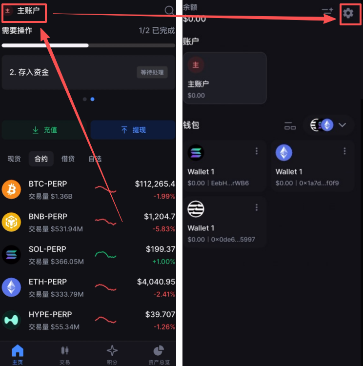 身份认证成功之后我们就可以去往里面进行充值了,我们可以点击左上角“主账户”这里的位置,然后再点击右上角这的设置图标。