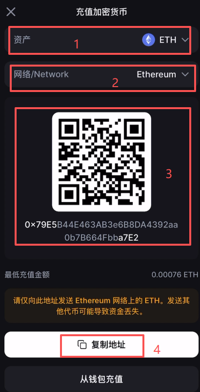 接下来我们就要把backpack交易所外面的钱给它充值到backpack交易所里面来。充的资产我们要选择ETH,网络就选择它自带的以太坊网络就可以了。下面这个二维码以及这串乱码就是我们的充币地址了,我们复制。