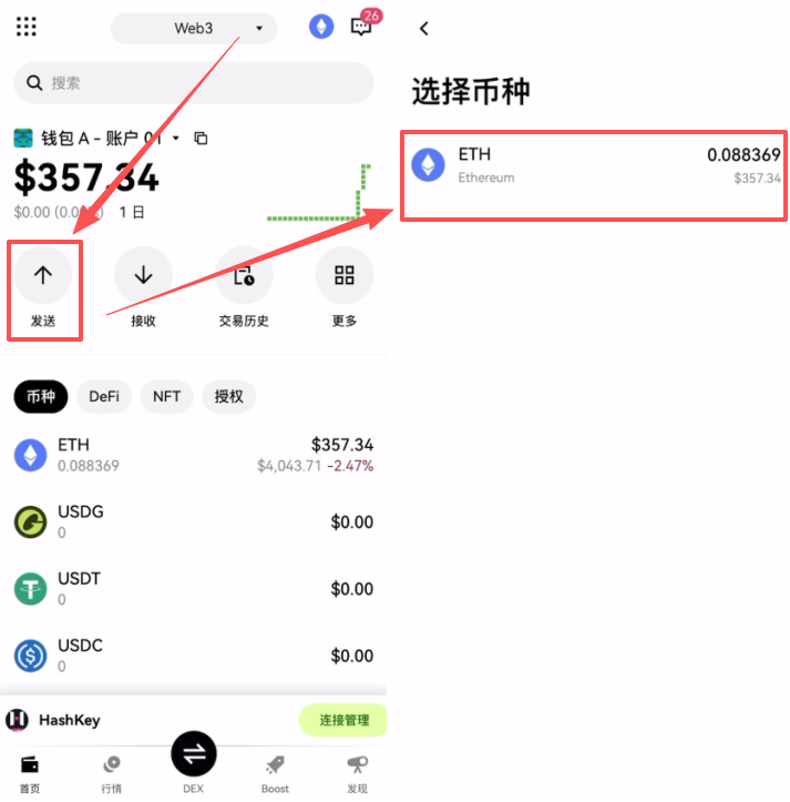 然后回到我的OKX Web3钱包,点击【发送】,币种选择“ETH”。