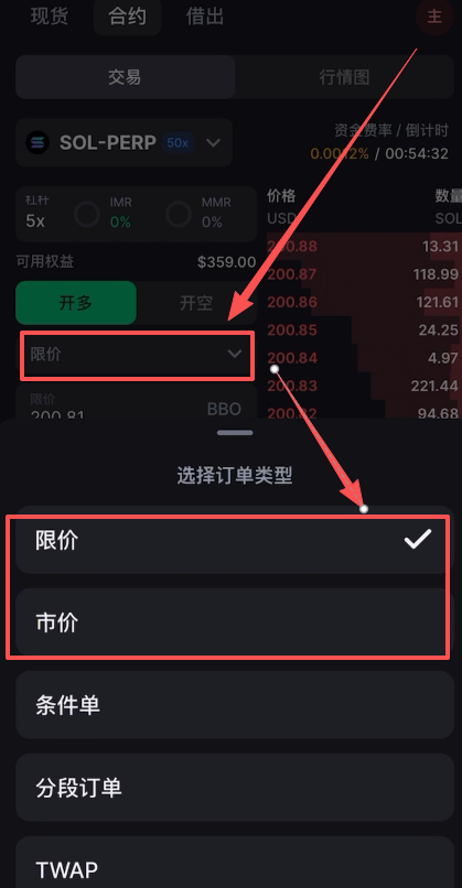 订单类型分为限价和市价,这里的限价和市价其实和现货的限价和市价是一样的。