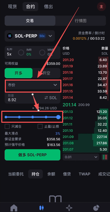 “限价”就是需要我们自己去设定一个理想的开空或者是开多的价格,等到市价达到了我们设定好的这个价格之后,这个委托的订单才会成交,否则他就会一直处于一个待成交的状态。这里为了方便演示,我选择“市价”。市价不需要我们自己去设定价格,平台会以当前市场最优的一个价格优先给我们下单。我这里把数量拉满,然后思考一个我是开多还是开空。