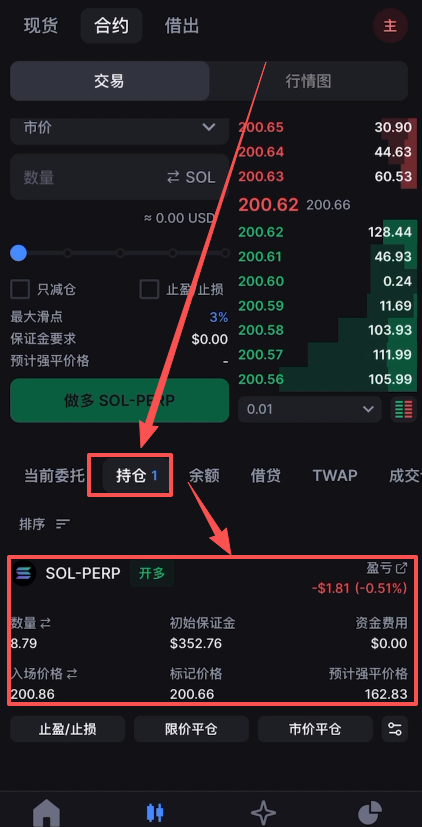 你可以在这里面去添加它的止盈止损,或者是如果你想要退场可以选择“限价平仓”或者“市价平仓”。限价平仓就是还需要我们设定一个理想的平仓价格,市价平仓就是以当前一个对我们最有利的价格直接平仓。比如说我这里就选择“市价平仓”。